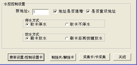 2   水控控制設置:新地址設置為1,把地址號是否遞增和是否重設機器號前面的選項選上,如下圖所示,點擊費率設置|控制設置卡按鈕,點擊控制設置卡, 即可成功制作成控制設置卡去修改聯網型水控一體機的機器號。控制設置卡在機器上數卡成功時會提示8 OK  9 OK  10 OK