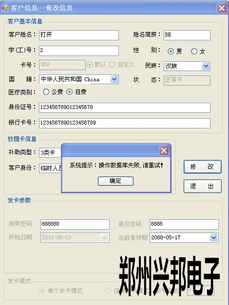 一卡通綜合管理平臺修改卡信息時出現(xiàn)如下提示
