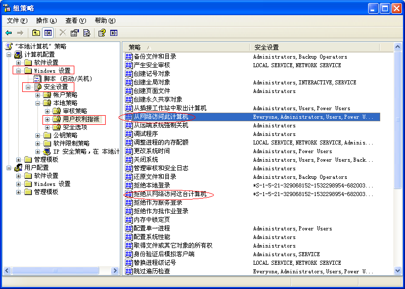2.打開 組策略-計算機(jī)配置-windows設(shè)置-安全設(shè)置-本地策略-用戶權(quán)利指派中,將Guest賬戶添加到從網(wǎng)絡(luò)訪問計算機(jī),拒絕從網(wǎng)絡(luò)訪問這臺計算機(jī)中將Guest賬戶刪除