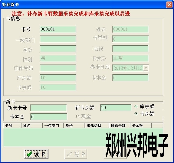 3. 此時(shí)先在軟件中把000001這張卡掛失了,然后點(diǎn)卡管理--補(bǔ)辦新卡(確保數(shù)據(jù)全部采集完),打開對(duì)話框后輸入卡號(hào)按回車鍵,當(dāng)出現(xiàn)卡信息后,把編號(hào)為000001的這張卡放到讀卡器上點(diǎn)讀卡,然后點(diǎn)確定即可。