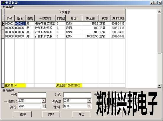 卡信息表主要用于查看卡的基本信息。可以選擇相應的條件,然后單擊【查詢】在表格中會出現相應條件的卡的基本信息,表的最下面顯示出所查詢出的總記錄數及庫金額匯總。