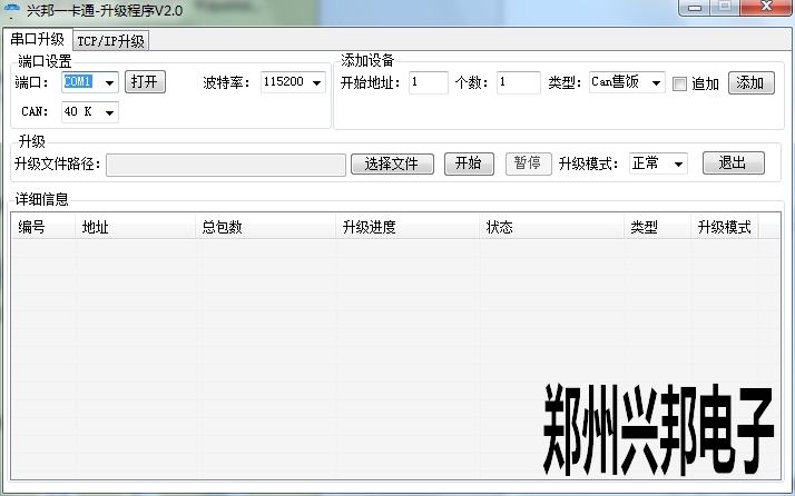 第三步:終端設備從應用程序進入升級界面后,關掉興邦在線升級工具后,重新打開興邦在線升級工具,并做以下配置:配置興邦在線升級工具中相應的端口、波特率19200、開始地址設為1、個數項為1、類型選擇終端門禁一體機、升級模式選擇正常,點擊添加按鈕后、選擇相應的文件,再點擊開始按鈕即可;直到升級完成。